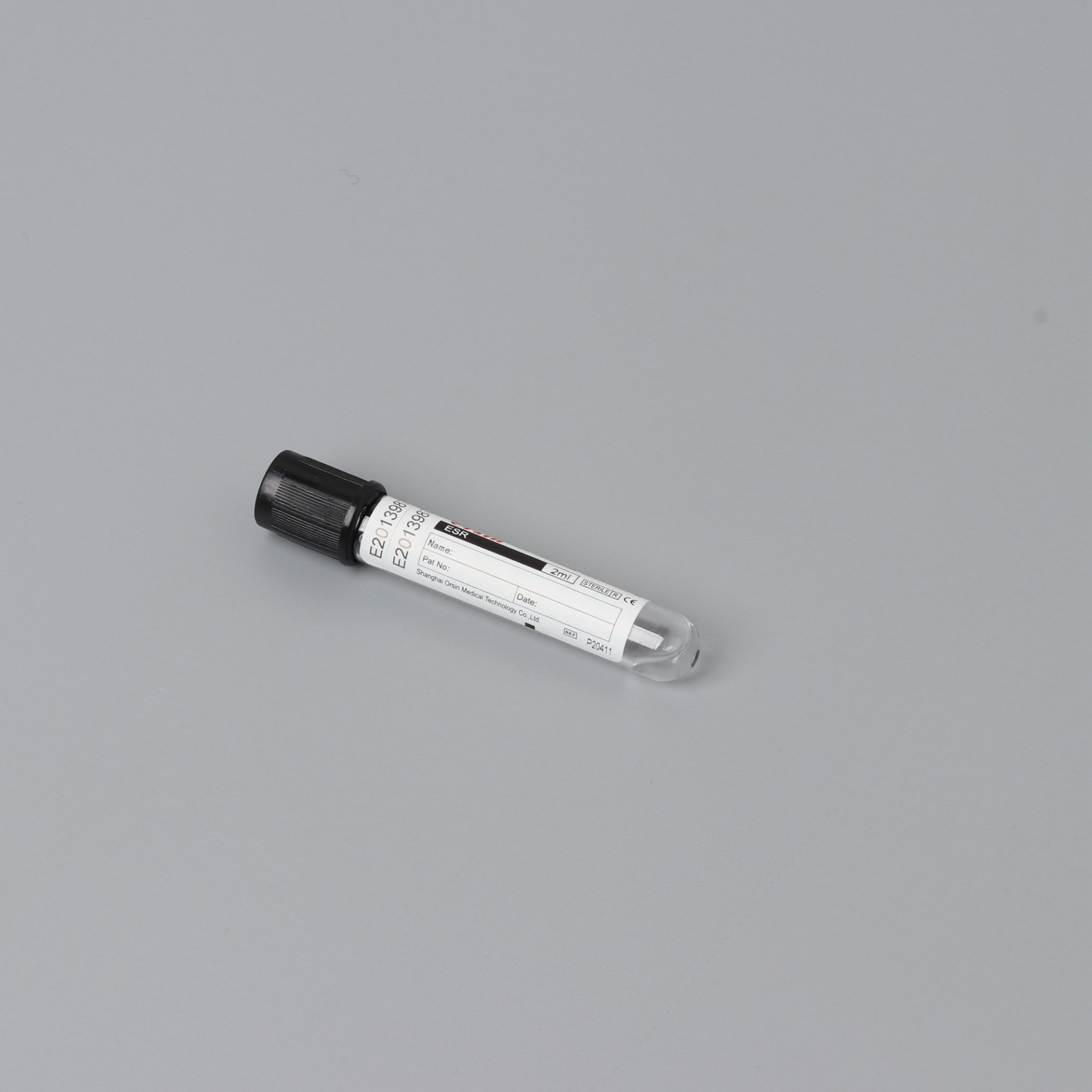 Black cap tubes, with 0.129mol/L sodium citrate buffer systems to carry out anticoagulation on blood specimen, are used for the testing blood sedimentation rate by Westergern method. The volume ratio between anticoagulant and blood is 1:4. They cover the dynamic blood sedimentation tube directly offering specimen and 75mm short tubes needing specimen transfer. Dynamic blood sedimentation tube may read directly on the frame after blood collection, or be used in blood sedimentation unit