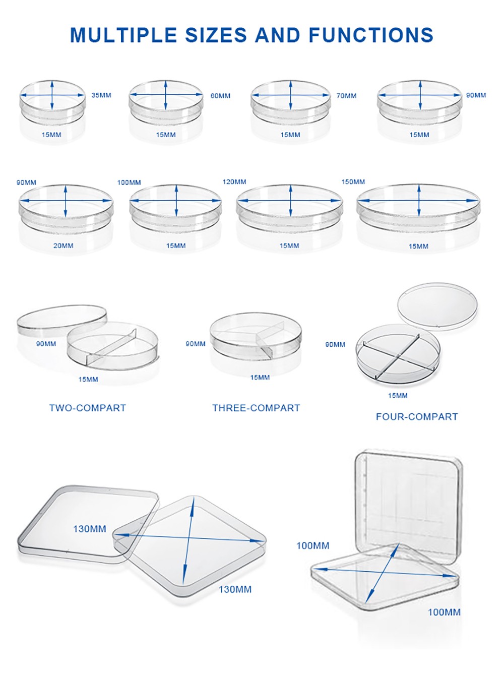 Ideal for laboratory analysis, school science projects, scientific research, seed cultivation, mycology research, and more.These Petri dishes are optically clear with good clarity in microscopy.Petri dishes have a flat growth surface for uniform cell growth without clumping.